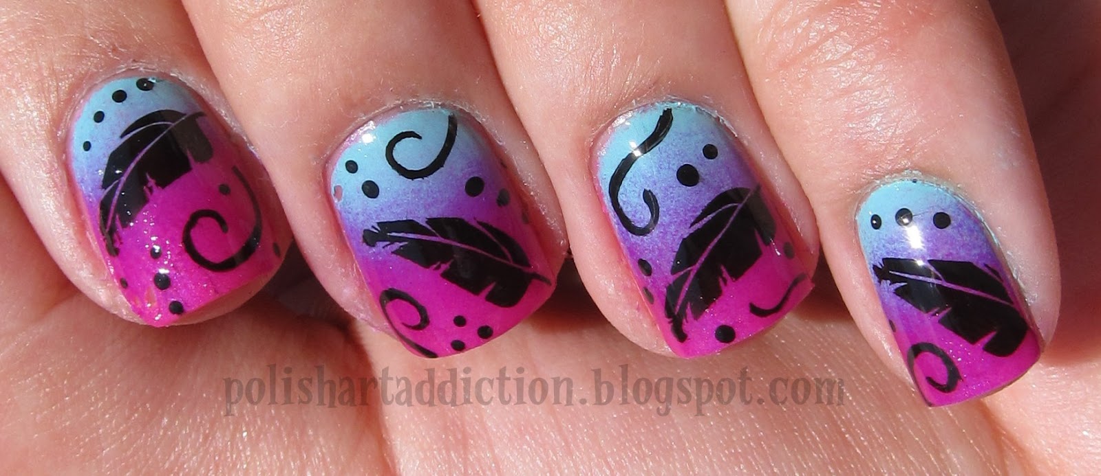 I used China Glaze Too Yacht To Handle, Color Club Power Play, & Orly Oh Cabana Boy for the gradient. Then the feather stamp is from Bundle Monster BM15 and I used Konad black polish for stamping. I freehanded the other swirl & dot details with a black striper polish.
