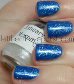 The story behind this particular franken is quite touching, a little sad and beautiful in its own way. See all that snowy shimmer floating over the Blue? That is one coat of January Morning. My nails looked frosted and icy. I seriously love this so much and how textured it looks.Pam's Girly Bits Hippity Hop over A England Princess Tears